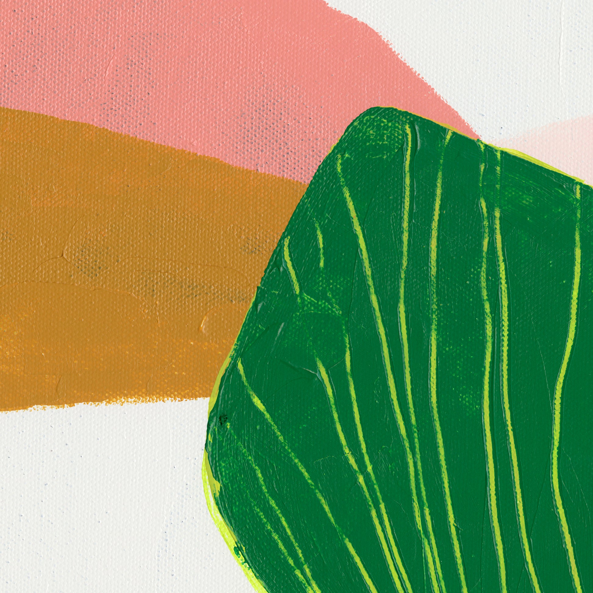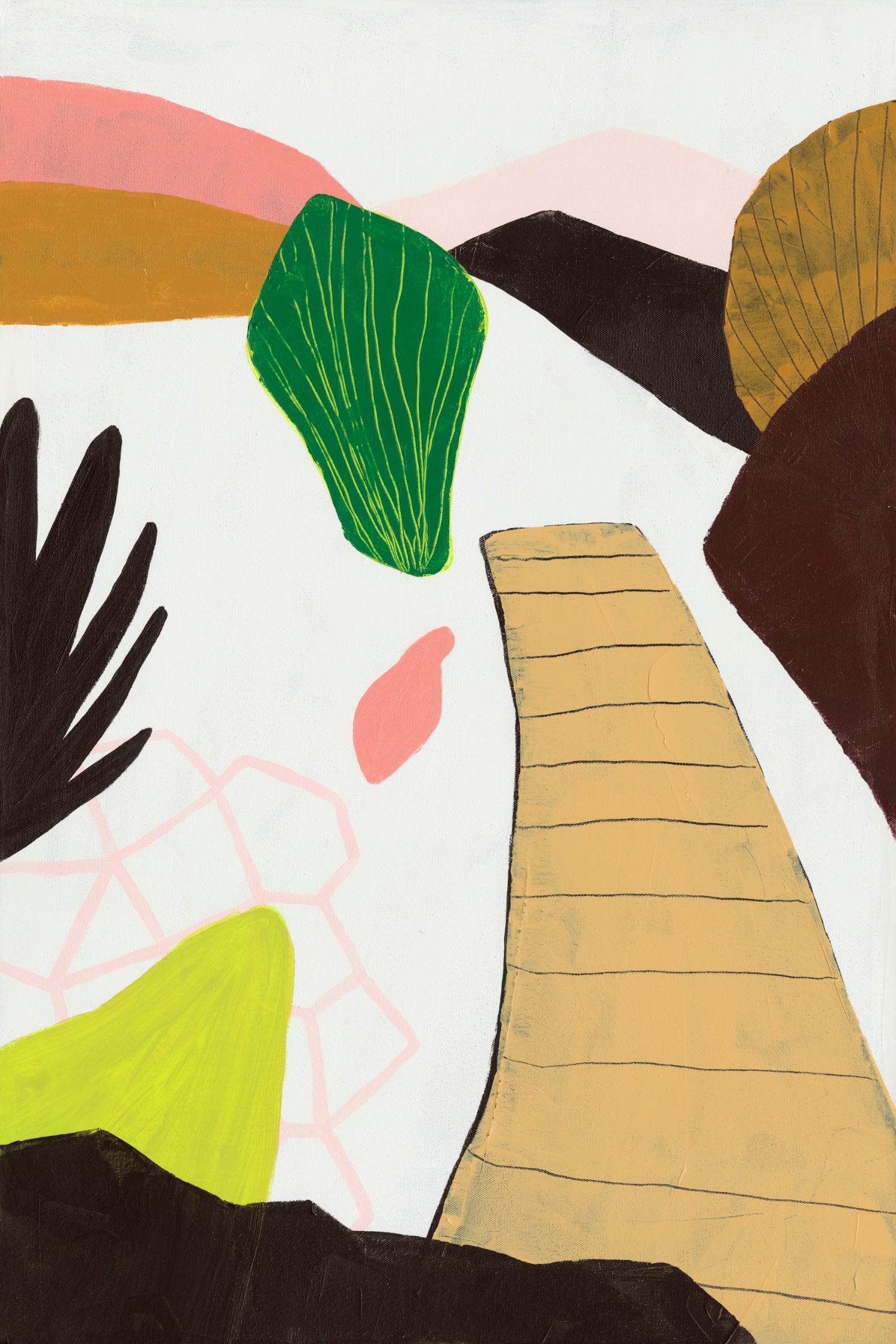 Wander up a mysterious path into the unknown as you embark on an exciting adventure. This almost surreal abstract landscape features a joyful color palette in pinks, greens and neutrals and lots of yummy texture.