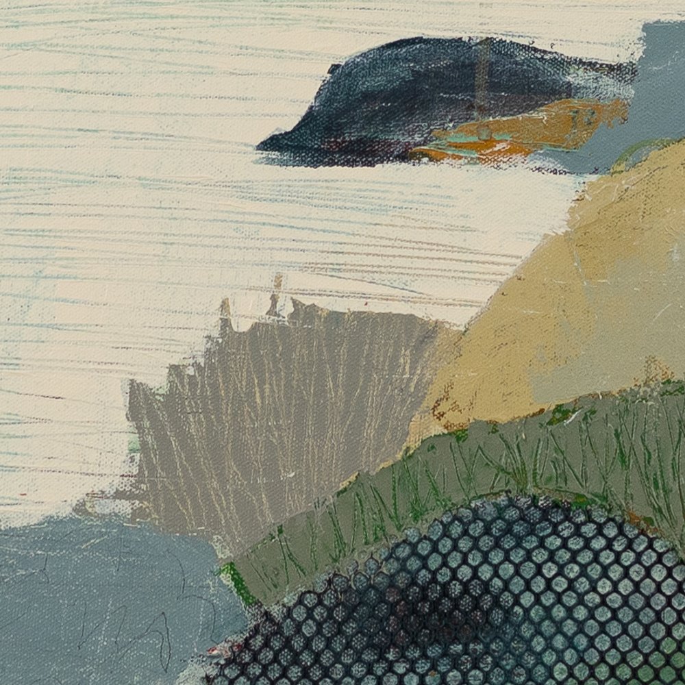 In muted shades of green and neutrals, the land bobs in and out of a watery landscape in this soothing fine art print meant to pull you out of your head and into your heart.